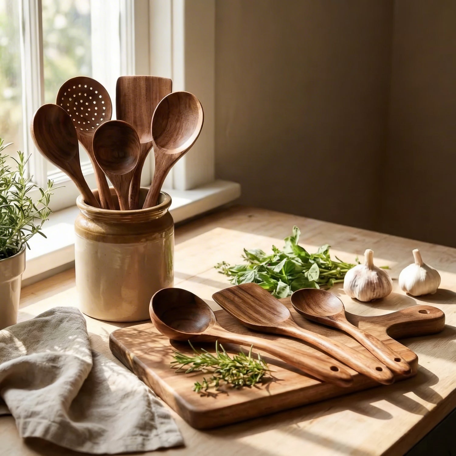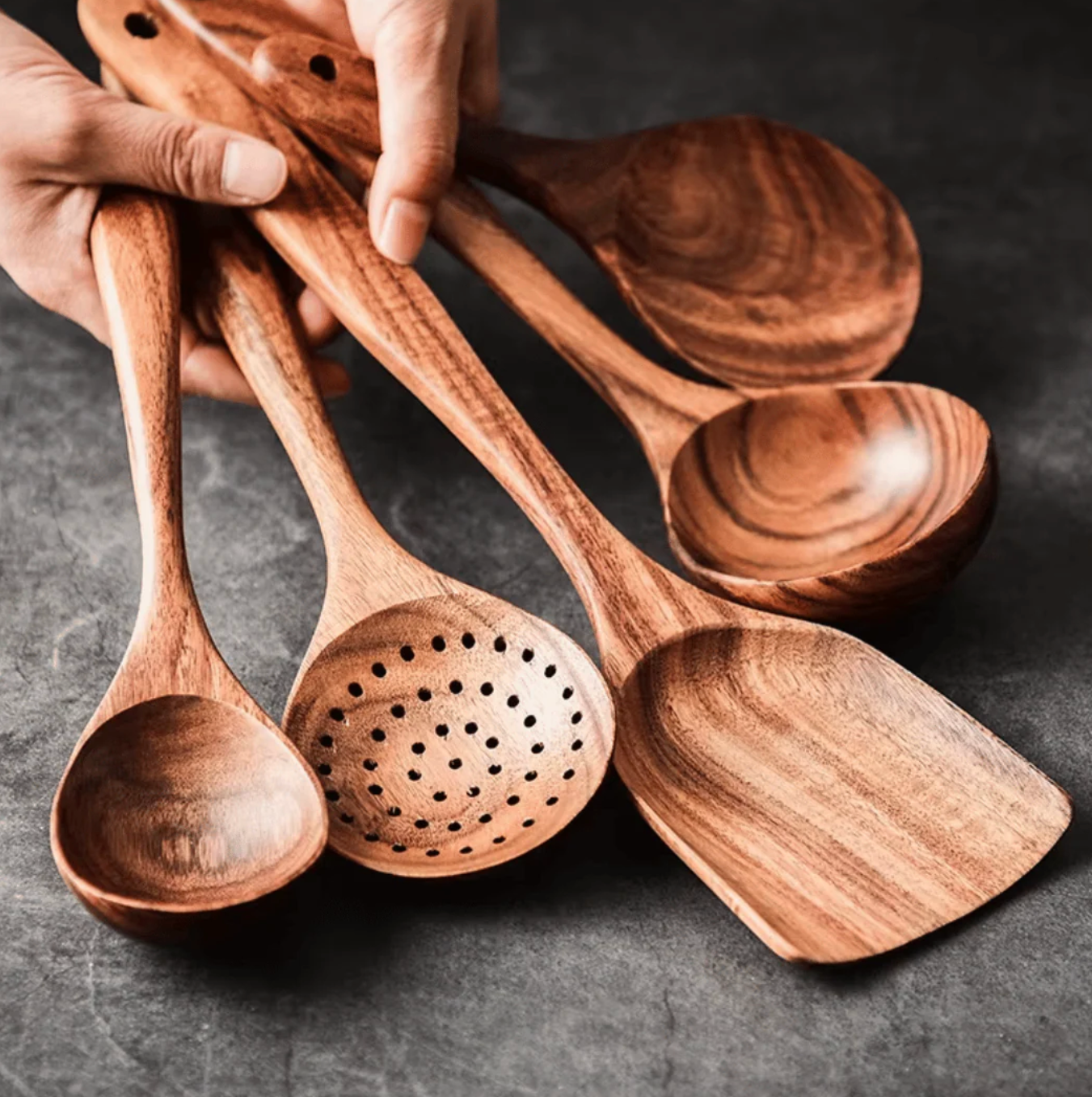 Unser PureKüche™ Set wird aus handverlesenem, zertifiziertem Teakholz gefertigt – dem „Gold der Hölzer“. Dank seines extrem hohen natürlichen Ölgehalts ist es von Natur aus antibakteriell, wasserabweisend und absolut geschmacksneutral. Während Plastik schmilzt, hält Teak jeder Hitze stand und schont dabei deine beschichteten Pfannen.